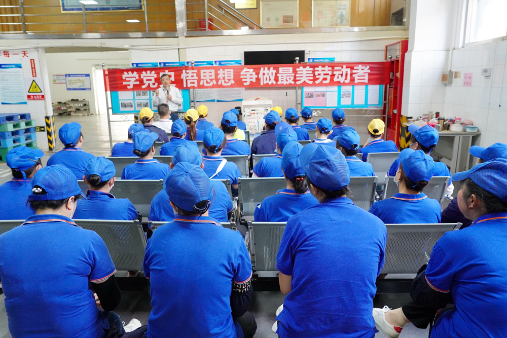 4月30日,黃鶴樓酒業(yè)工會(huì)主席、黨工團(tuán)中心副總監(jiān)張瑞以《學(xué)黨史、悟思想、爭(zhēng)做最美勞動(dòng)者》為主題,為包裝車間職工講授專題黨課。