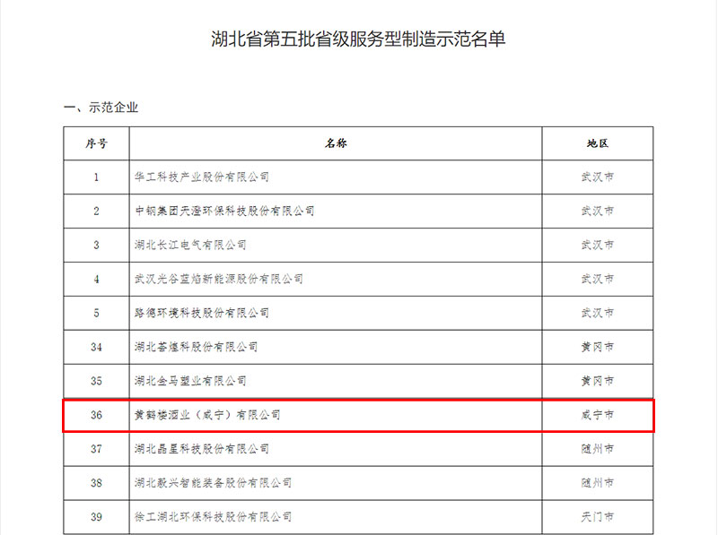 5月30日,湖北省經(jīng)濟(jì)和信息化廳公布第五批省級(jí)服務(wù)型制造示范名單。黃鶴樓酒業(yè)(咸寧)有限公司獲評(píng)第五批省級(jí)服務(wù)型制造示范企業(yè)。