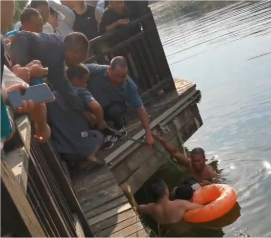放眼看去,十幾米外的通羊河邊已經(jīng)圍了不少人,快步跑到河邊,看到一位婦女不慎落入水中。黃國勇顧不得多想,即刻躍入水中進(jìn)行救援,吳仕田急中生智找來電瓶車?yán)K用來拉起落水者。黃國勇用盡全力將落水者托出水面,隨后,另一位聽到呼救的群眾也一起下水參加救援,二人用拉車?yán)K將落水婦女固定后,岸上的人借力拉起,多方合力,最終成功將落水者營(yíng)救上岸,整個(gè)救援過程持續(xù)了近20分鐘。