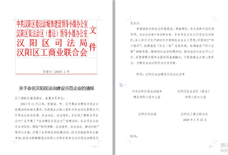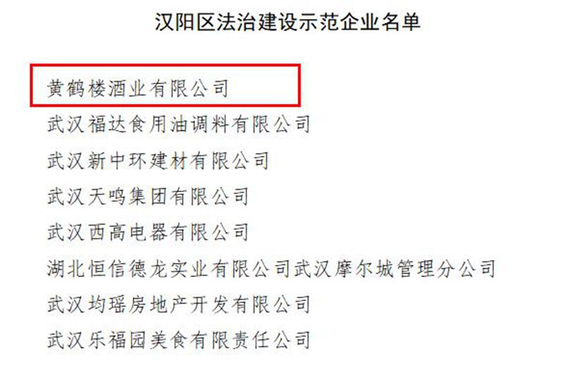 日前,漢陽區(qū)委法治辦、區(qū)普法辦、區(qū)司法局、區(qū)工商聯(lián)部門聯(lián)合發(fā)文,通報命名“漢陽區(qū)法治建設(shè)示范企業(yè)”。黃鶴樓酒業(yè)榮獲“漢陽區(qū)法制建設(shè)示范企業(yè)”。