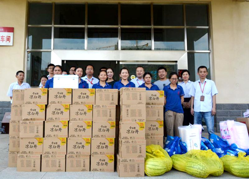 朱明鳳一行給黃鶴樓酒業(yè)員工送來(lái)了礦泉水、西瓜、醫(yī)藥箱及毛巾等物資,并對(duì)員工的工作和生活情況表示關(guān)心與關(guān)愛(ài)。