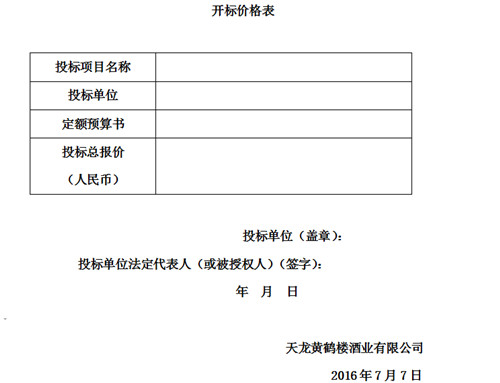 六、開標(biāo)、評標(biāo)、定標(biāo):由天龍黃鶴樓酒業(yè)有限公司另行通知。