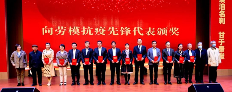 (許鵬(右七)、魏國(guó)(右三)被授予“勞模抗疫先鋒”稱(chēng)號(hào))