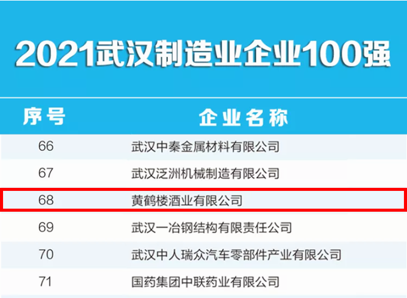 8月23日,2021年武漢企業(yè)100強榜單發(fā)布,黃鶴樓酒業(yè)榮登2021武漢制造業(yè)企業(yè)100強。