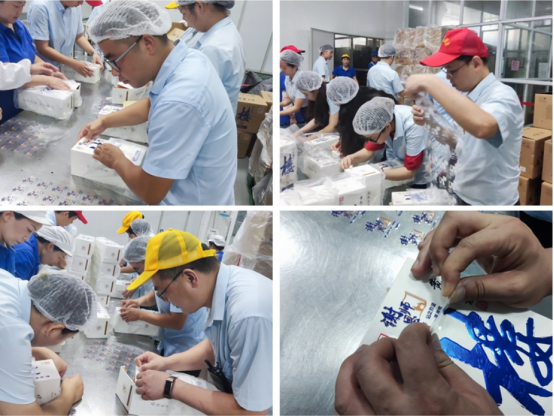 為確保樓20謝恩師定制產(chǎn)品順利生產(chǎn)上市,生產(chǎn)黨支部、財務(wù)審計黨支部響應(yīng)號召,充分發(fā)揮黨員先鋒模范作用,開展產(chǎn)品貼標活動。時間緊、任務(wù)重,黨員們在車間工作人員指導(dǎo)下有序進行貼標,埋頭苦干、一絲不茍,與一線員工齊奮斗,本著不浪費一張標,不貼花一個盒子原則,保質(zhì)保量完成任務(wù)。