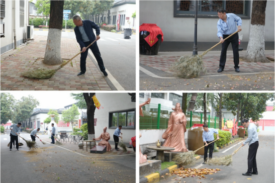 清晨八時(shí)許,行政黨支部黨員們拿起笤帚、撮箕,對昨日風(fēng)雨過后的殘枝落葉等進(jìn)行清理。