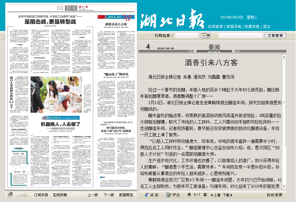 黃鶴樓酒業(yè)武漢廠區(qū)有4個車間——釀造車間里,大年初六已開始潤糧,42名工人全部到崗,為新年開工做準備;勾儲車間,初七迎來了2019年的首批原酒;罐裝、包裝車間,生產(chǎn)線全開,初七當天就有8000多箱酒下線,運往全國各地。“春節(jié)前我們進行了產(chǎn)品布局和優(yōu)化,2019年全部采用新技術。”生產(chǎn)管理中心總監(jiān)陳彥龍介紹,瓶蓋的電鍍工藝污染大,現(xiàn)在改為絲印、噴涂,乳玻瓶成本高、生產(chǎn)過程不環(huán)保,現(xiàn)在換成透明玻璃瓶,不僅環(huán)保可回收,一年還可節(jié)約成本至少300萬元。此外,過完正月十五,公司利用2萬平方米的廠房屋頂打造的光伏發(fā)電項目改造工程,也將正式動工。