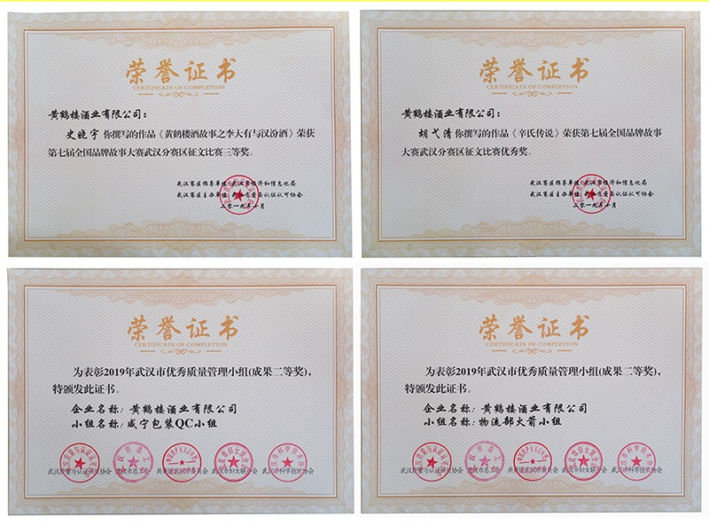 近日,黃鶴樓酒業(yè)在第七屆全國品牌故事大賽與質量管理小組活動中取得優(yōu)秀成績,咸寧包裝QC小組、物流部火箭小組榮獲“2019年武漢市優(yōu)秀質量管理小組(成果二等獎)”,作品《黃鶴樓酒故事李大有與漢汾酒》榮獲“第七屆全國品牌故事大賽武漢分賽區(qū)征文比賽三等獎”,作品《辛氏傳說》榮獲“第七屆全國品牌故事大賽武漢分賽區(qū)征文比賽優(yōu)秀獎”。
